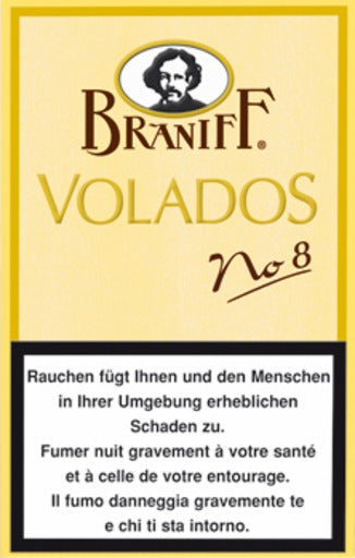Die Braniff Volados No. 8 ist ein handgefertigtes Zigarillo, das für sein mildes bis mittelkräftiges Aroma geschätzt wird. Mit einer Länge von 101 mm und einem Durchmesser von 15 mm (Ringmaß 38) bietet es eine Rauchdauer von etwa 15 Minuten. Die Einlage besteht aus einer Mischung karibischer Tabake, umhüllt von einem hochwertigen Ecuador-Deckblatt. Diese Kombination verleiht dem Zigarillo Aromen von Holz, Nuss und einer dezenten Süße. Es hat eine milde bis mittelkräftige Stärke.