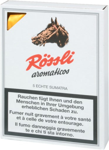 Die Rössli Aromaticos Sumatra ist eine handgefertigte Zigarre aus der Schweiz, die für ihr mildes bis mittelkräftiges Aroma geschätzt wird. Mit einer Länge von 110 mm und einem Durchmesser von 15 mm bietet sie eine Rauchdauer von etwa 20 Minuten. Die Einlage besteht aus einer sorgfältig ausgewählten Tabakmischung, umhüllt von einem hochwertigen Sumatra-Deckblatt. Diese Kombination verleiht der Zigarre Aromen von Holz, Erde und einer dezenten Süße. Die Rössli Aromaticos Sumatra wird in Etuis mit 5 Stück angeboten und eignet sich ideal für Liebhaber eines kurzen, aber intensiven Rauchgenusses.