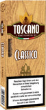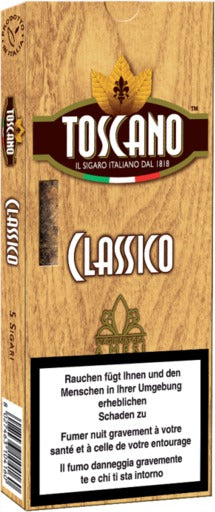 Die Toscano Classico ist eine handgefertigte Zigarre, die für ihr mittelkräftiges bis vollmundiges Aroma geschätzt wird. Mit einer Länge von 150 mm und einem Ringmaß von 38 (Durchmesser ca. 15,08 mm) bietet sie eine Rauchdauer von etwa 50 Minuten. Die Einlage, das Umblatt und das Deckblatt bestehen aus Dark Fired Kentucky Tabaken aus Italien. Diese Kombination verleiht der Zigarre Aromen von Holz, Erde und einer dezenten Pfefferwürze.