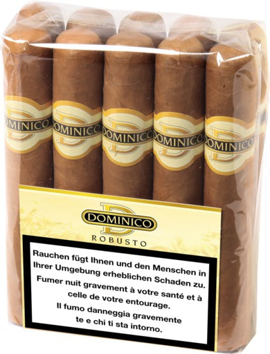 Die Villiger Dominico Robusto ist eine handgefertigte Zigarre aus der Dominikanischen Republik, die für ihr mildes und ausgewogenes Aroma geschätzt wird. Mit einer Länge von 127 mm und einem Ringmaß von 52 (Durchmesser ca. 20,6 mm) bietet sie eine Rauchdauer von etwa 45 bis 60 Minuten. Die Einlage besteht aus nicaraguanischem Piloto-Tabak, umhüllt von einem indonesischen Umblatt und einem ecuadorianischen Connecticut-Deckblatt. Diese Kombination verleiht der Zigarre Aromen von Gras, Holz und einer dezenten Süße. Die Villiger Dominico Robusto ist sowohl einzeln als auch in 10er-Bundles erhältlich.