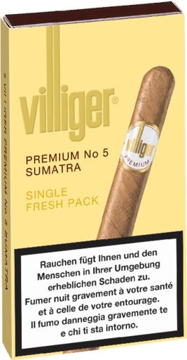 Die Villiger Premium No. 5 Sumatra ist eine hochwertige Zigarre, die für ihr mildes bis mittelkräftiges Aroma geschätzt wird. Mit einer Länge von 122 mm und einem Durchmesser von 15 mm (Ringmaß 38) bietet sie eine Rauchdauer von etwa 20 Minuten. Die Einlage besteht aus einer sorgfältig ausgewählten Mischung von Tabaken aus Südamerika und Brasilien, umhüllt von einem hochwertigen Sumatra-Deckblatt.